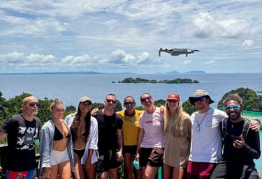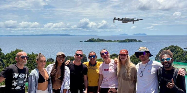 Group of travelers snorkeling in clear turquoise waters surrounded by vibrant coral reefs.